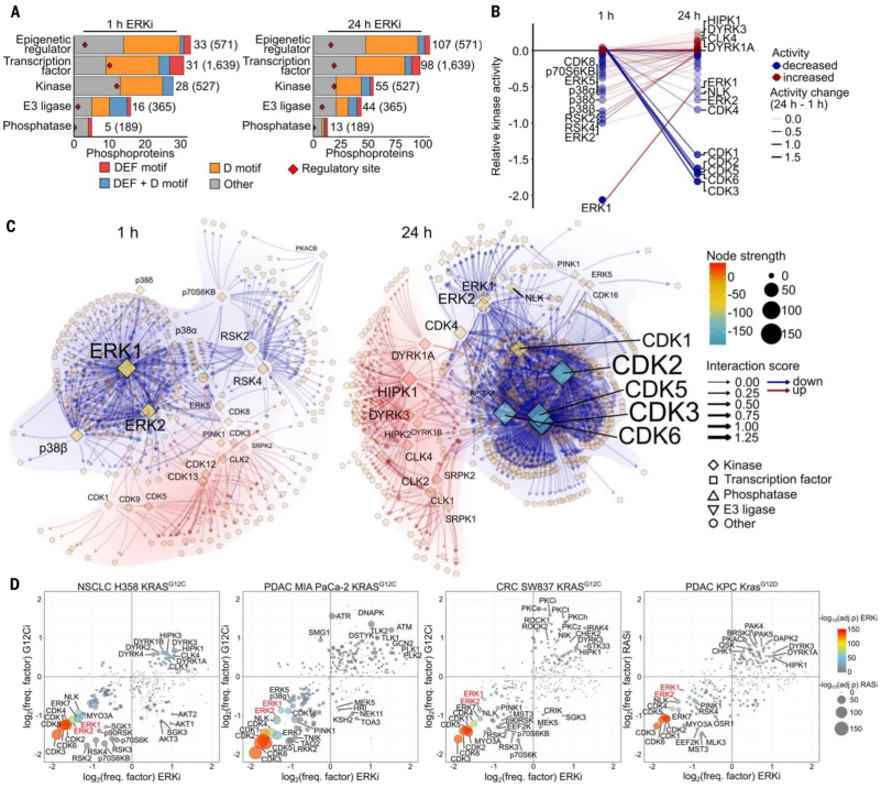 ERK參與調(diào)控基因轉(zhuǎn)錄、蛋白質(zhì)磷酸化和蛋白質(zhì)穩(wěn)定性,影響廣泛的蛋白質(zhì)類別,包括表觀遺傳調(diào)控因子、轉(zhuǎn)錄因子和激酶等,這些蛋白的磷酸化狀態(tài)受到ERK的調(diào)控,并驅(qū)動(dòng)ERK依賴的信號傳導(dǎo)。ERK抑制導(dǎo)致這些蛋白的磷酸位點(diǎn)數(shù)量顯著減少。ERK抑制導(dǎo)致細(xì)胞周期依賴性激酶(CDKs)、MAPKs、糖原合成酶激酶(GSKs)和CDK樣激酶(CLKs)等激酶家族的調(diào)節(jié)失常。特別是,ERK抑制后ERK1和ERK2的基序顯著下調(diào),而RSKs、MAPKs和CDKs等激酶在長時(shí)間抑制后也顯示出調(diào)節(jié)失常。同時(shí),還觀察到一些之前未被確定為ERK的直接靶標(biāo)的激酶,如HIPKs、CLKs和DYRKs,在ERK抑制后補(bǔ)償性活性增加。盡管KRAS可以結(jié)合多個(gè)效應(yīng)子,但ERK和KRAS調(diào)控的激酶之間差異很小,這強(qiáng)調(diào)了ERK在KRAS信號傳導(dǎo)中的核心作用。