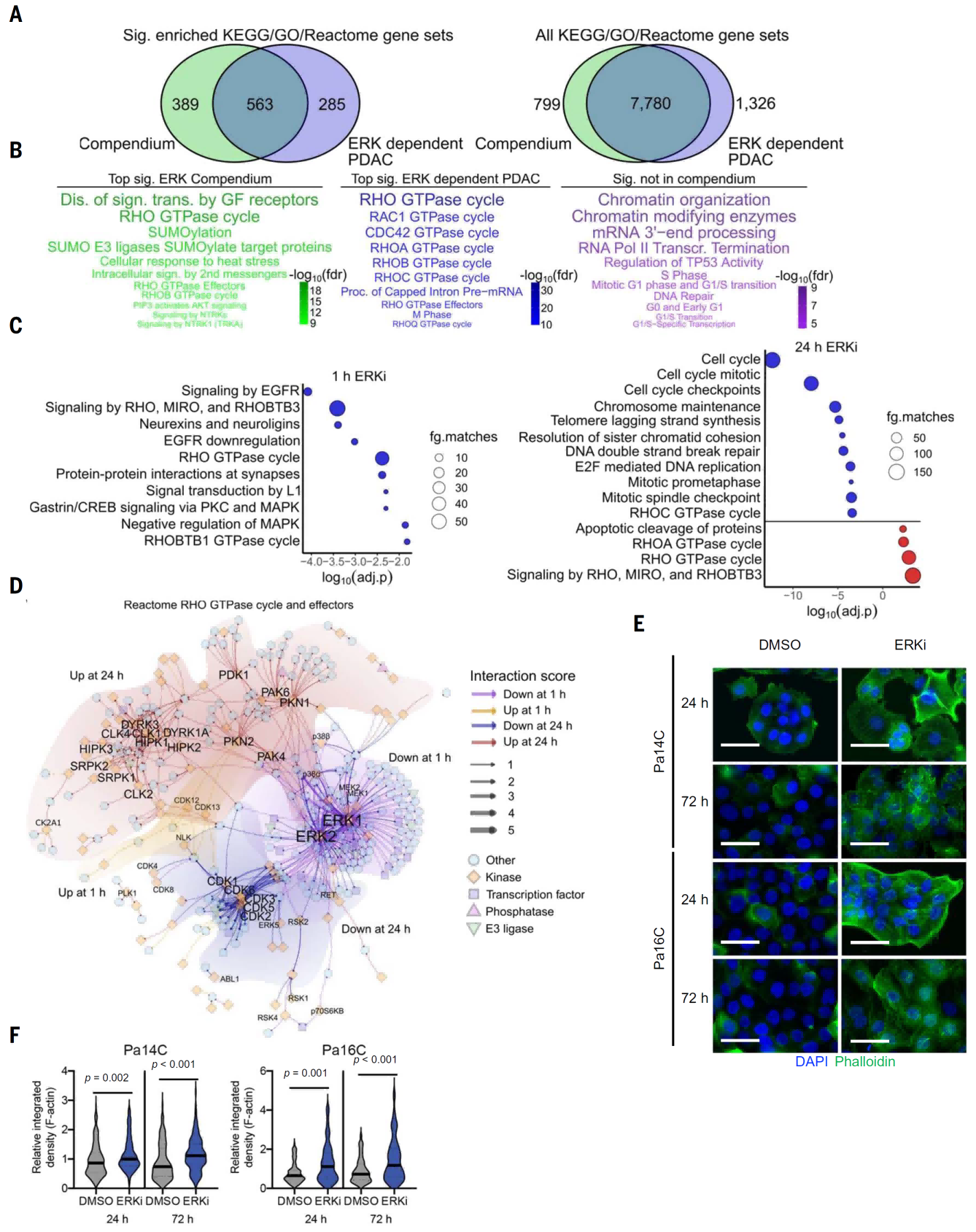 通過GO、KEGG和Reactome數(shù)據(jù)庫的分析,發(fā)現(xiàn)PDAC中ERK依賴的磷酸化蛋白質(zhì)組與ERK通路數(shù)據(jù)庫存在66%重疊,但一致性僅為33%。這些磷酸化蛋白質(zhì)與RHO GTPase信號通路、染色質(zhì)組織、RNA處理和G1/S細(xì)胞周期等過程顯著相關(guān),暗示了異常ERK激活在PDAC中的全面作用。進(jìn)一步的研究揭示了短期抑制主要影響RHO GTPase和EGFR/MAPK信號通路,而長期抑制則影響細(xì)胞周期和有絲分裂等更廣泛的細(xì)胞過程。特別是,RHO GTPase信號通路在長期抑制后由下調(diào)轉(zhuǎn)變?yōu)樯险{(diào),提示存在對ERK抑制的補(bǔ)償機(jī)制。