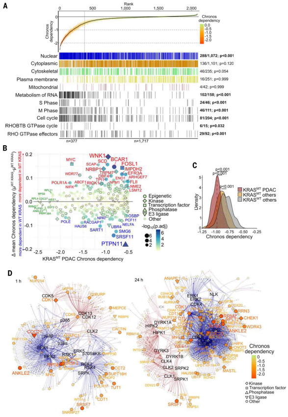 通過CRISPR-Cas9技術(shù),在KRAS突變型PDAC細(xì)胞系中識別了1636個(gè)具有遺傳依賴性的基因,并在磷酸化蛋白質(zhì)組學(xué)數(shù)據(jù)集中檢測到690相關(guān)基因,其中超過一半與ERK調(diào)控的磷酸位點(diǎn)有關(guān)。研究進(jìn)一步揭示了這些基因產(chǎn)物在細(xì)胞核和細(xì)胞質(zhì)中的分布,并特別關(guān)注了RHO GTPase及其效應(yīng)子,以及RNA代謝和細(xì)胞周期組分(特別是M期和S期)在PDAC生長中的重要作用。此外,還探討了這些ERK調(diào)控的磷酸化蛋白質(zhì)在KRAS突變型癌癥中的選擇性遺傳依賴性,并發(fā)現(xiàn)了一些在KRAS突變型PDAC中特別關(guān)鍵的基因,如FRA1、MYC和p130CAS。最后,提出了一個(gè)模型,即ERK通過調(diào)節(jié)CDK1激活和細(xì)胞周期S期及M期進(jìn)展的磷酸化蛋白質(zhì)來推動(dòng)PDAC生長。