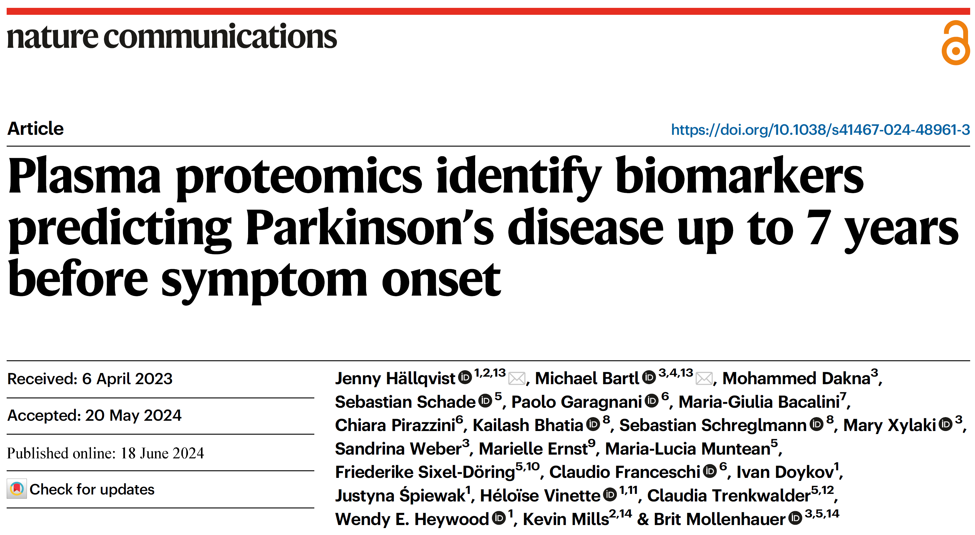 今年6月18日,倫敦大學(xué)和德國(guó)哥廷根大學(xué)醫(yī)學(xué)中心研究團(tuán)隊(duì)在《Nat Commun》(IF:14.7)雜志上發(fā)表題為:《Plasma proteomics identify biomarkers predicting Parkinson's disease up to 7 years before symptom onset》的相關(guān)研究。該研究通過(guò)高通量串聯(lián)質(zhì)譜技術(shù)分析血液樣本,發(fā)現(xiàn)了與帕金森病相關(guān)的8種蛋白質(zhì),機(jī)器學(xué)習(xí)模型根據(jù)8種蛋白質(zhì)的表達(dá)成功區(qū)分患者與健康人,并在發(fā)展為運(yùn)動(dòng)性癥狀前7年預(yù)測(cè)了79%的非運(yùn)動(dòng)癥狀的受試者。