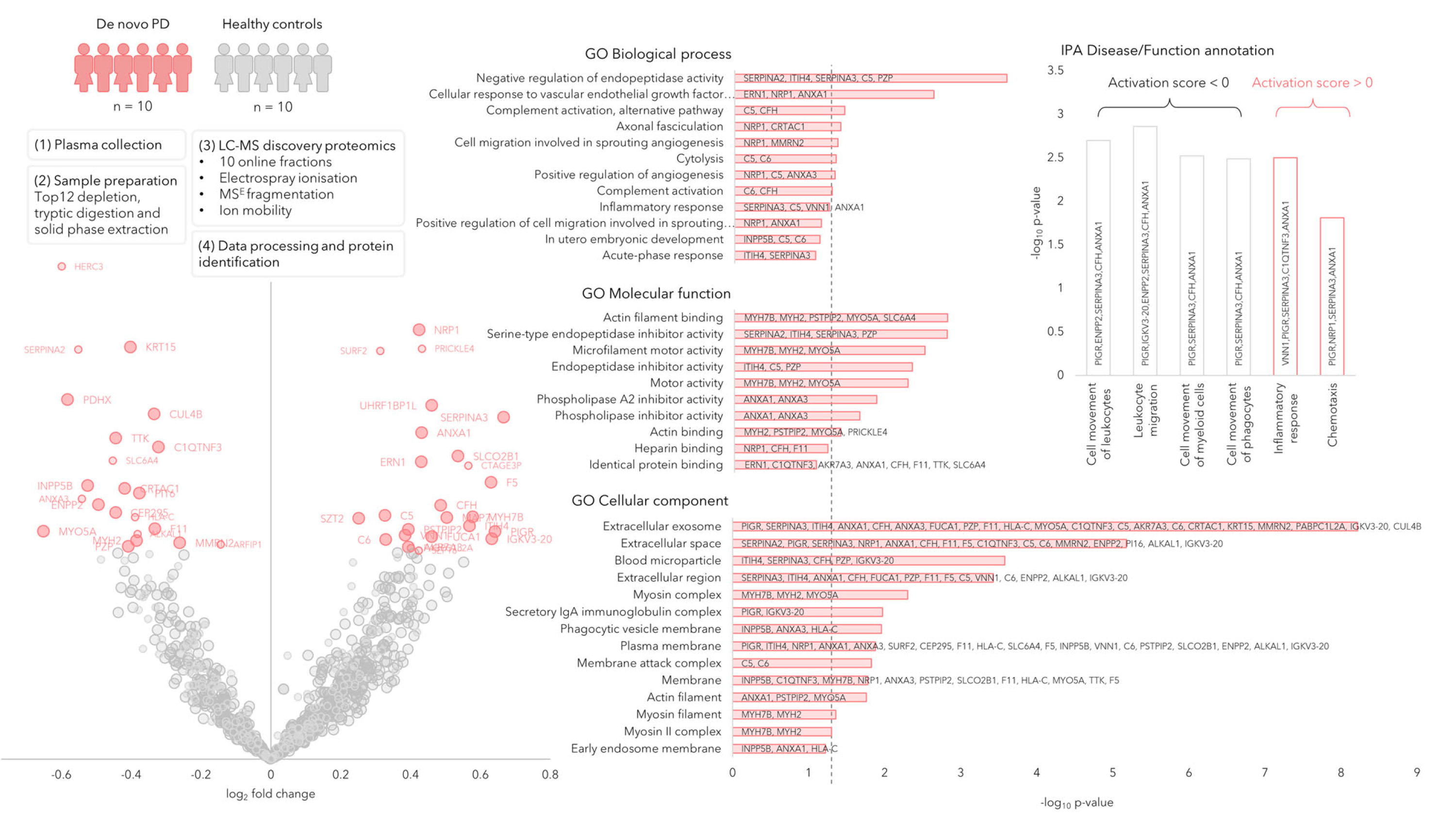 發(fā)現(xiàn)隊(duì)列由隨機(jī)挑選的十名藥物治療無(wú)效的帕金森病患者和十名HC組成。該分析發(fā)現(xiàn)了1238個(gè)蛋白質(zhì),經(jīng)數(shù)據(jù)前處理后,剩余895個(gè)蛋白質(zhì)。在這些蛋白質(zhì)中,有47個(gè)蛋白質(zhì)在PD組和對(duì)照組之間差異表達(dá)。通路分析表明,這些蛋白在幾種炎癥通路中富集。