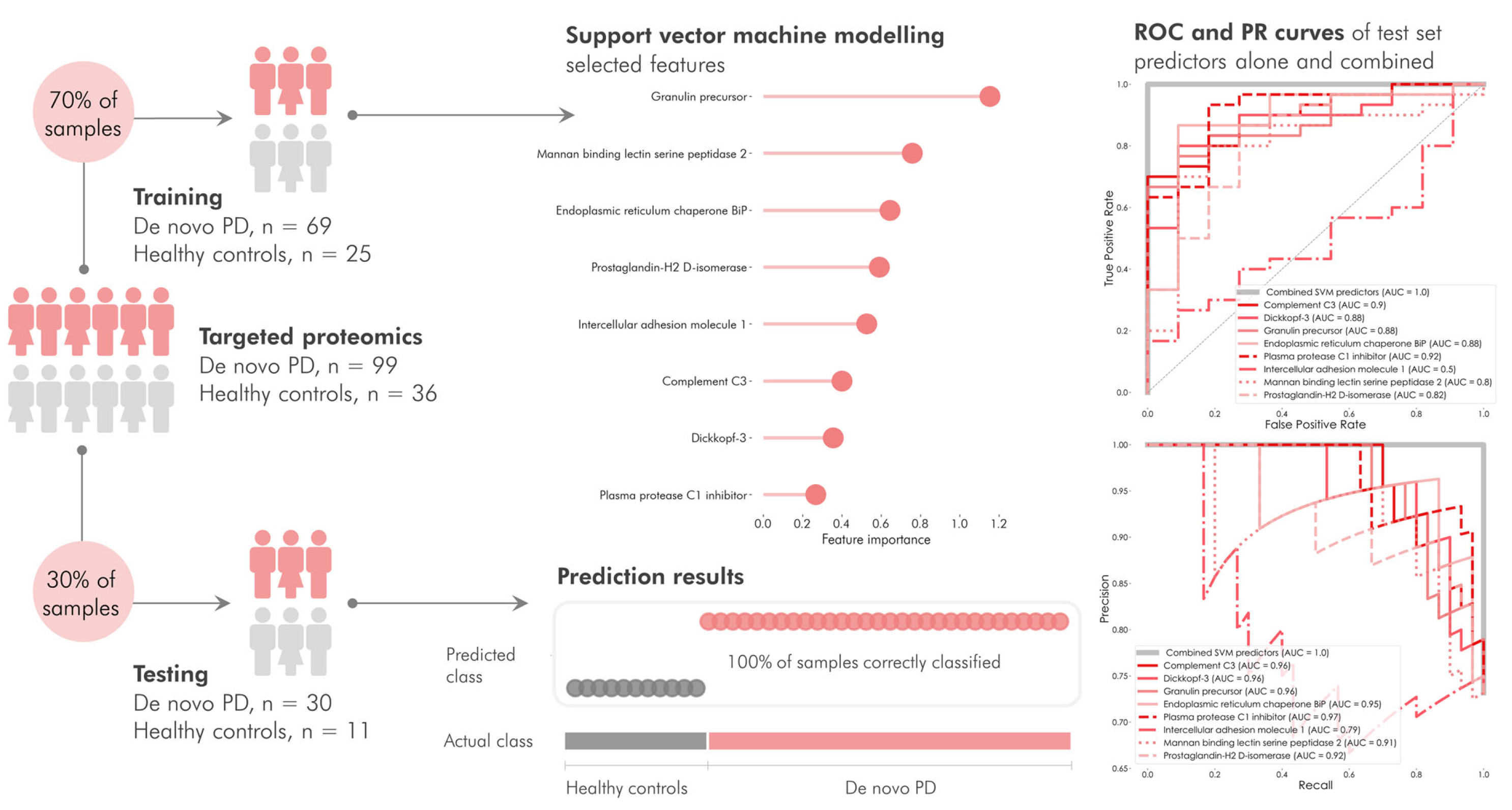 該研究繼續(xù)探討了觀察到的蛋白質(zhì)表達(dá)能否用于建立一個(gè)回歸模型,以預(yù)測(cè)個(gè)體是屬于PD組還是HC組。確定了一組能以100%的準(zhǔn)確率區(qū)分PD和HC的蛋白質(zhì),然后構(gòu)建了一個(gè)線性支持向量分類模型。特征選擇的結(jié)果是一個(gè)包含八個(gè)預(yù)測(cè)因子的模型:GRN、MASP2、HSPA5、PTGDS、ICAM1、C3、DKK3和SERPING1。模型對(duì)訓(xùn)練數(shù)據(jù)進(jìn)行了預(yù)測(cè),結(jié)果是所有樣本都被歸入了正確的類別。在接收者操作特征曲線(ROC)和精確度-召回曲線(PR)曲線上,該標(biāo)志物組合的AUC都達(dá)到了1.0(圖4)。證明該模型以100%的準(zhǔn)確率對(duì)原發(fā)性帕金森病(PD)樣本或?qū)φ諛颖具M(jìn)行了分類和分離。