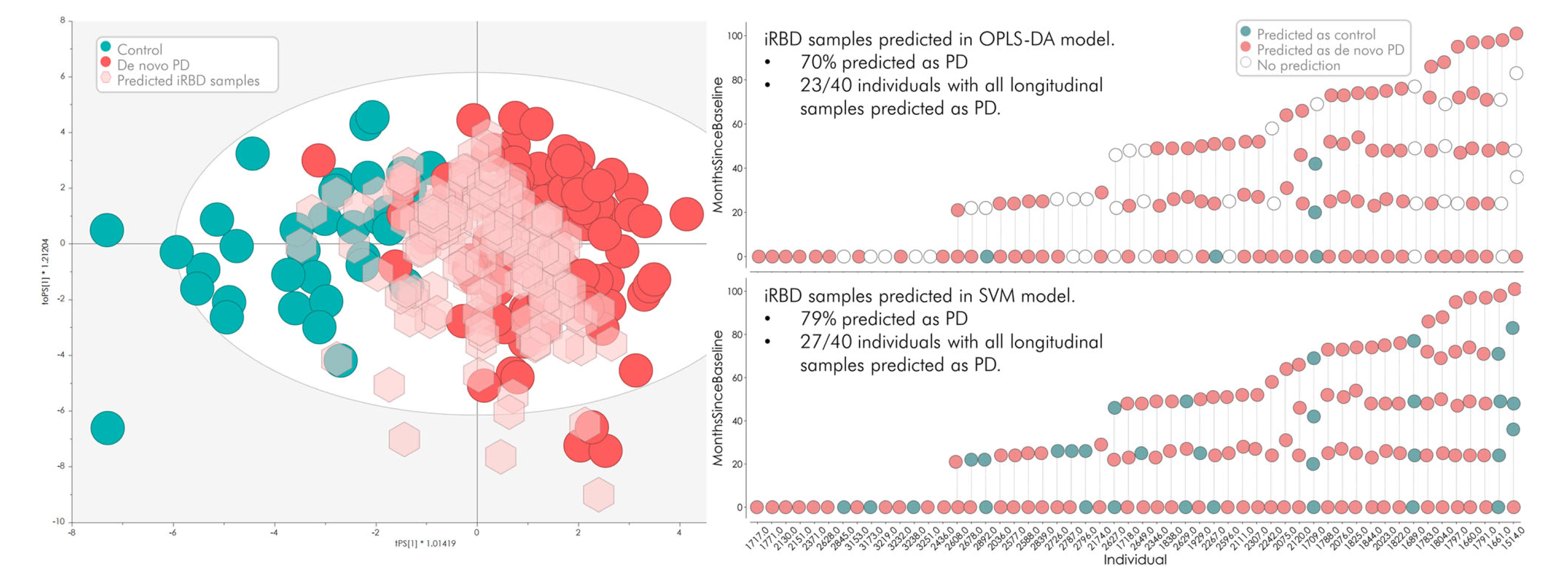 該研究將第二階段所有可用的縱向iRBD樣本(n= 146)應(yīng)用于第一階段構(gòu)建的兩個(gè)機(jī)器學(xué)習(xí)模型(OPLS-DA和支持向量機(jī)SVM)(PD vs. HC)。OPLS-DA模型基于所有32個(gè)檢測(cè)到的蛋白質(zhì),將70%的iRBD樣本鑒定為PD,而SVM模型基于8個(gè)蛋白質(zhì)面板,將79%的樣本鑒定為PD。如上所述,在進(jìn)行分析時(shí),iRBD驗(yàn)證隊(duì)列中的54名受試者中有16人已發(fā)展為PD/DLB。因此,最早的正確分類發(fā)生在表型轉(zhuǎn)換前7.3年,最晚的正確分類發(fā)生在診斷前0.9年(平均3.5±2.4年)。