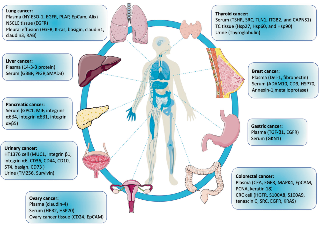 與其他類型的外泌體貨物(DNA、mRNA、miRNA、circRNA、lncRNA和代謝物)相比,外泌體中的蛋白質(zhì)可以提供豐富、穩(wěn)定、敏感和獨特的信息。外泌體蛋白被報道為多種癌癥的特異性診斷和預(yù)后因素,包括乳腺癌、泌尿系統(tǒng)癌癥、肺癌、胃癌、肝癌、結(jié)直腸癌、卵巢癌、甲狀腺癌和胰腺癌。因此,外泌體在臨床診斷和治療中的應(yīng)用潛力將不斷增加。