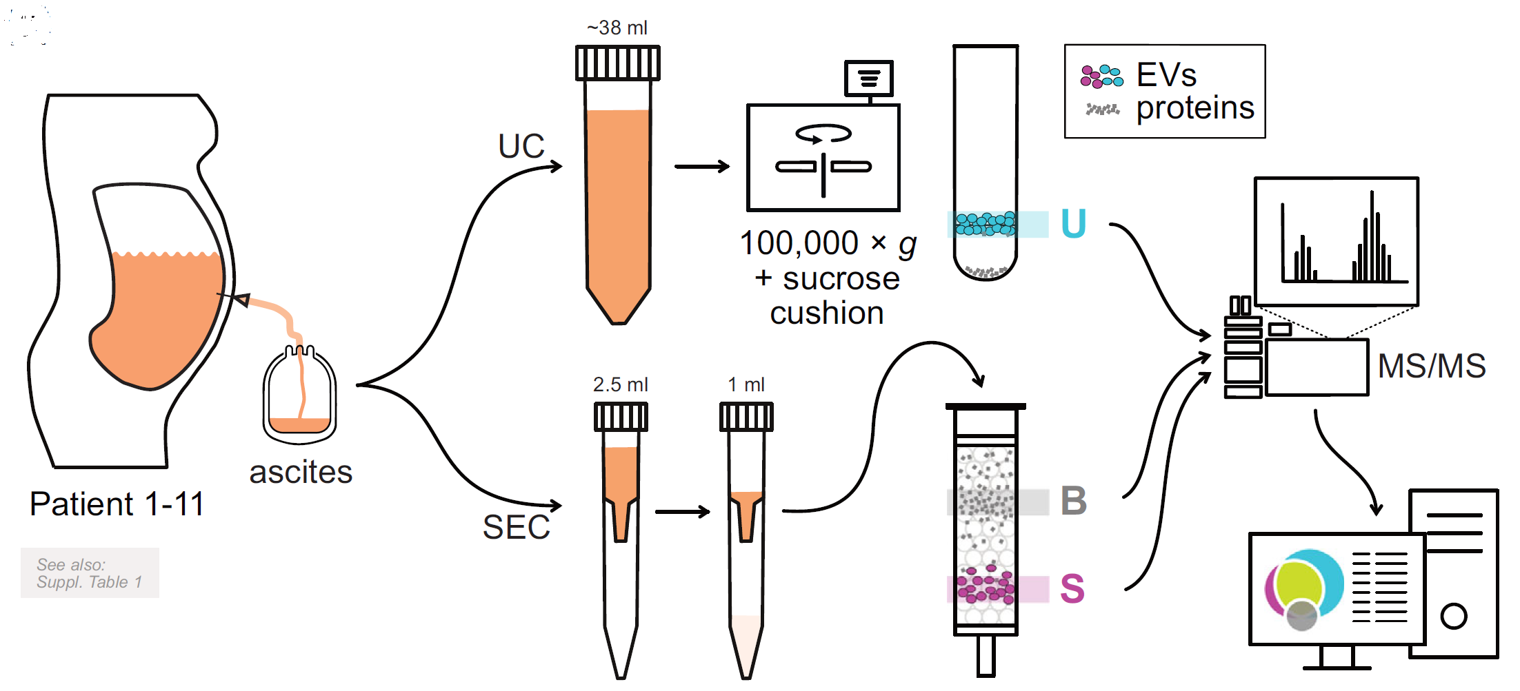 2024年3月1日,馬薩里克大學(xué)科研團隊在《J Extracell Vesicles》(IF:16)發(fā)表題為“Proteomic analysis of ascitic extracellular vesicles describes tumour microenvironment and predicts patient survival in ovarian cancer”的研究成果。該研究從高級別卵巢漿液性癌(HGSC)患者腹水中分離出外囊泡(EVs),并用質(zhì)譜法對其進行蛋白質(zhì)組學(xué)分析。發(fā)現(xiàn)HGSC中細胞類型特異性EVs蛋白標志物的分析具有預(yù)后潛力。這為更好地了解 EVs 在腫瘤促進/預(yù)防中的作用以及改進 HGSC 診斷開辟了新途徑。