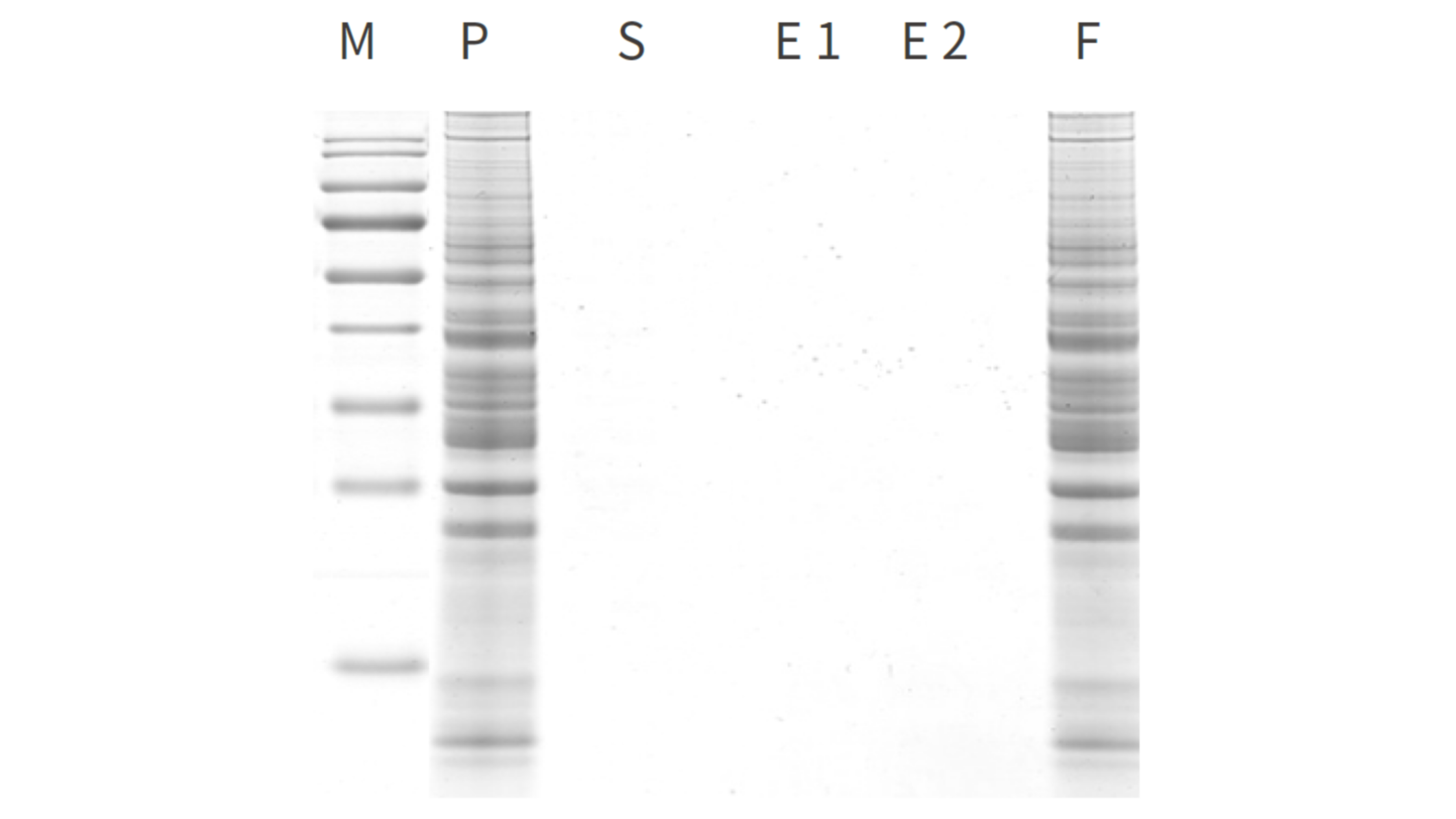 M:Marker P:10μg 細(xì)胞裂解液 S: MMB 磁珠與細(xì)胞裂解液孵育后的上清 E1: 第 1 次清洗 MMB 磁珠的緩沖液 E2: 第 2 次清洗 MMB 磁珠的緩沖液 F: 蛋白質(zhì)回收溶液 按照電泳灰度值計算蛋白回收率為:99.9%