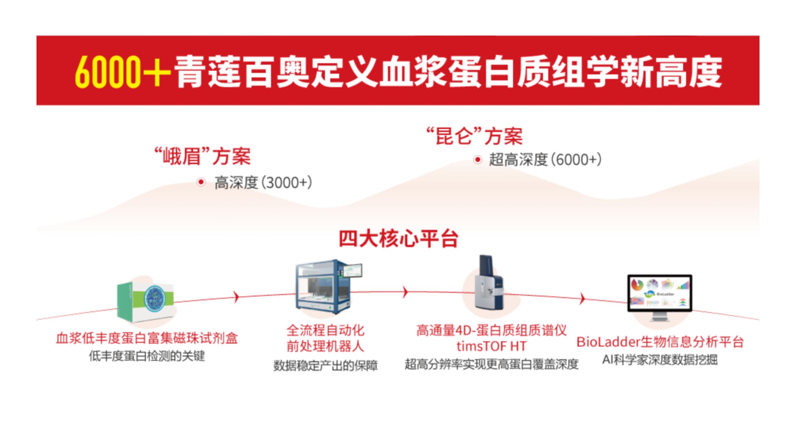青蓮百奧將自主研發(fā)的血漿低豐度蛋白富集磁珠試劑盒、全流程自動(dòng)化前處理機(jī)器人和高通量timsTOF HT質(zhì)譜儀結(jié)合,克服血漿樣品復(fù)雜性高、低豐度蛋白檢測(cè)深度低的難題,成功將血漿蛋白質(zhì)組的檢測(cè)深度提升至6000+,為血漿蛋白質(zhì)組學(xué)研究帶來革命性的突破!