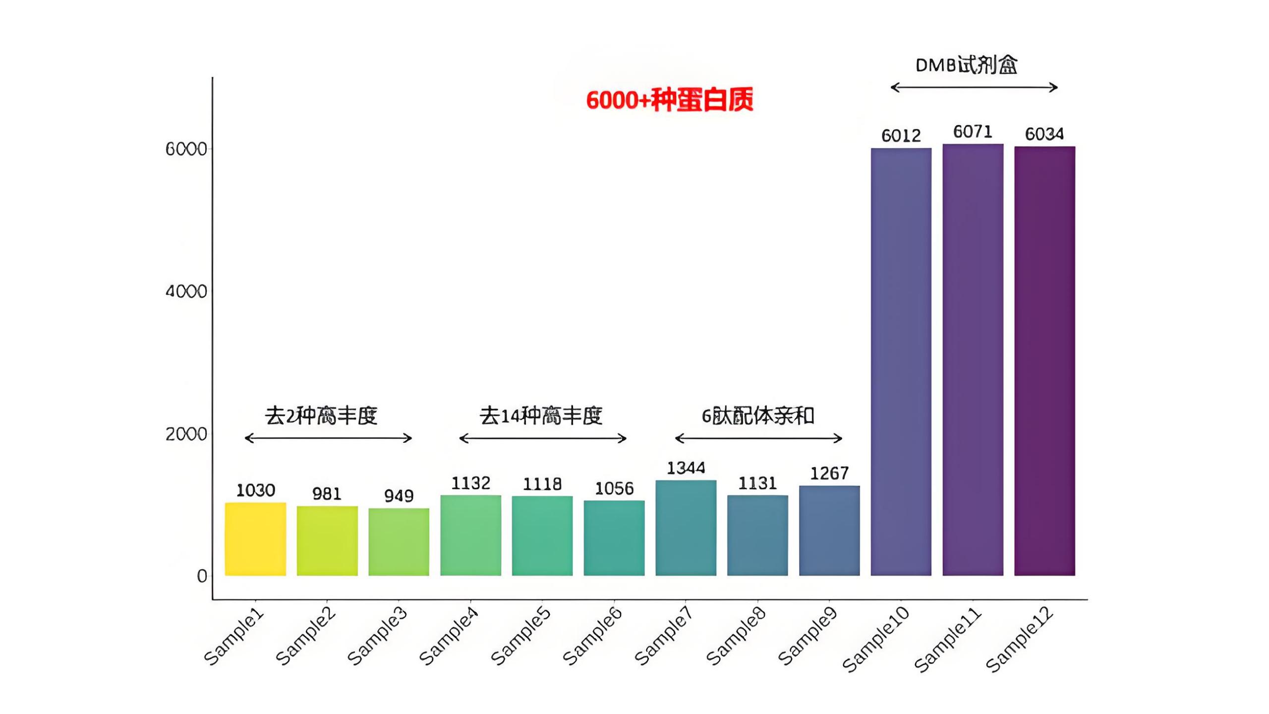 利用自主研發(fā)的血漿低豐度蛋白富集磁珠試劑盒(MagicOmics-DMB)對(duì)血漿樣本中的低豐度蛋白進(jìn)行富集,使用自主研發(fā)的全流程自動(dòng)化前處理機(jī)器人(MagicOmics-AP-96)進(jìn)行樣本制備,然后使用高通量timsTOF HT質(zhì)譜儀進(jìn)行蛋白質(zhì)檢測(cè),實(shí)現(xiàn)血漿蛋白質(zhì)組超高深度覆蓋。與富集前的血漿樣本相比,利用MagicOmics-DMB富集樣本的蛋白質(zhì)鑒定數(shù)目大大提升,從富集前的409個(gè)蛋白質(zhì),提升至富集后的6071個(gè)。